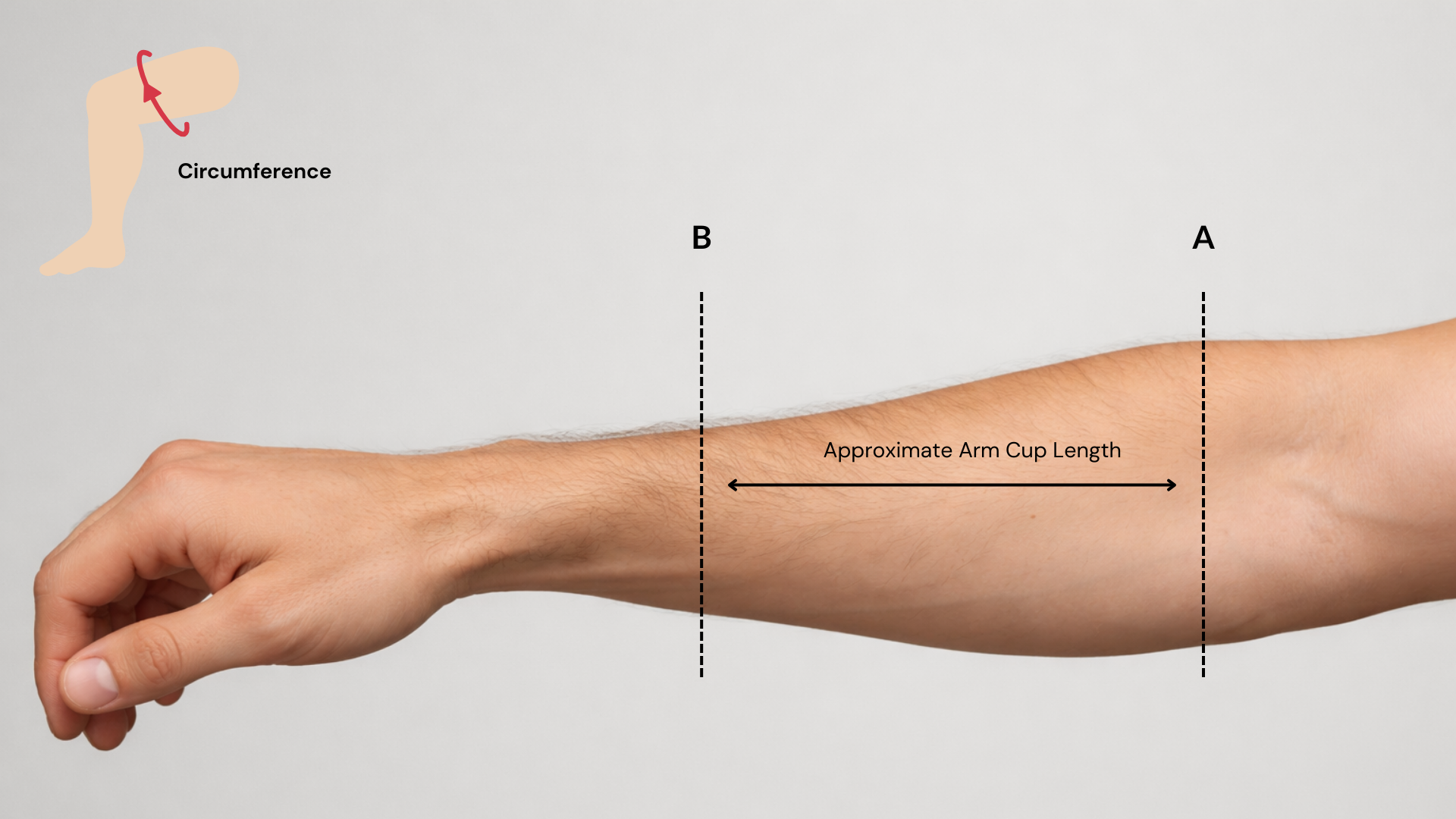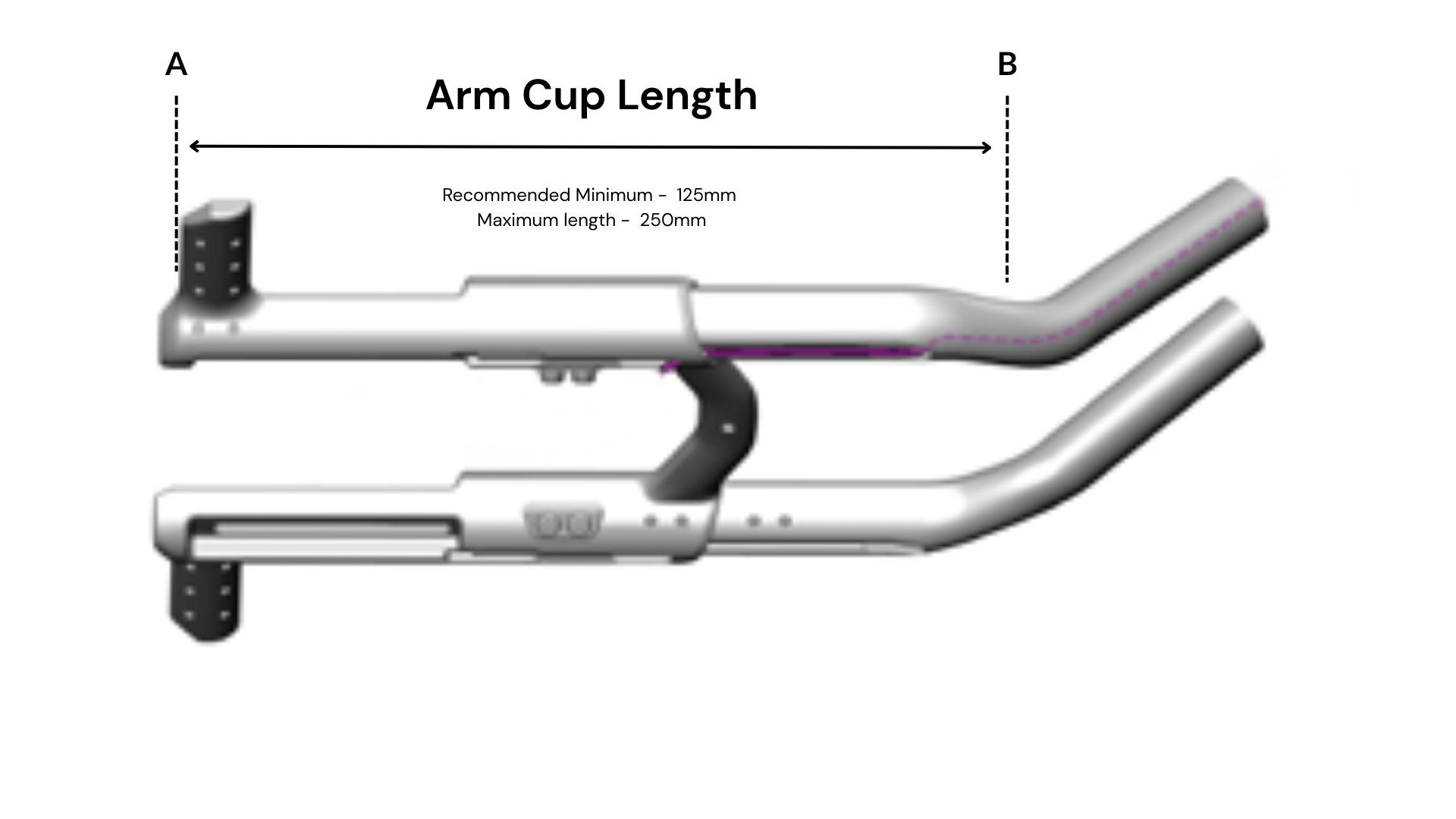 The distance between A → B should match your chosen arm cup length (shown in the image as the approximate arm cup length).